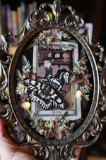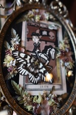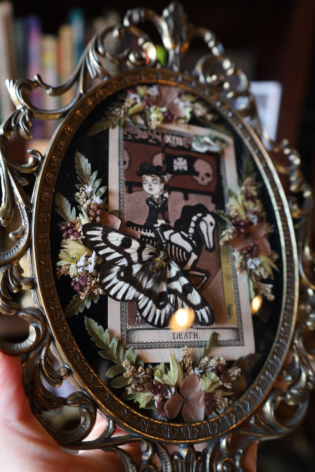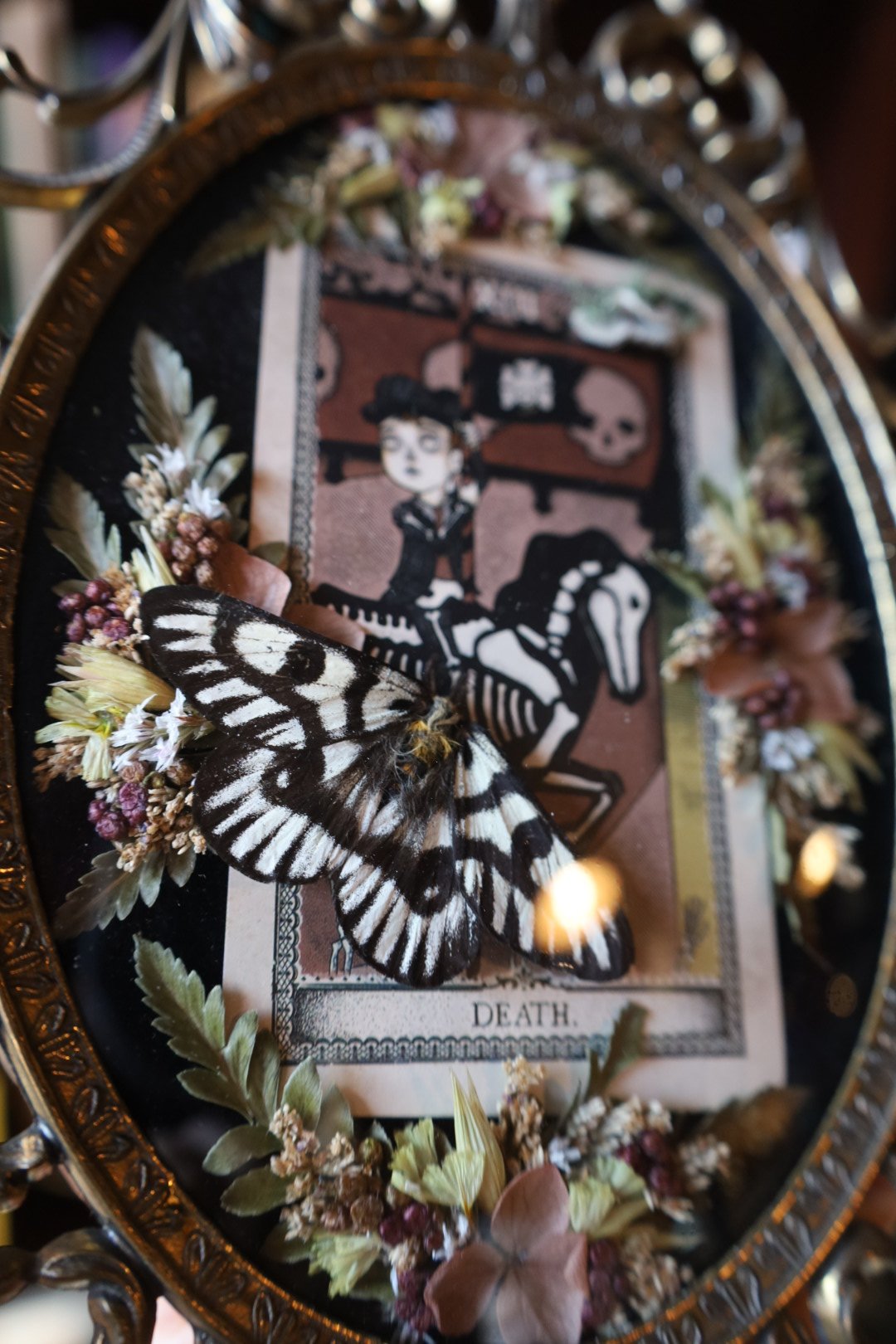 Tarot card from the Orphans of Dudleytown deck, Hera Buckmoth, turkey tail mushrooms, and dried florals in a vintage frame.