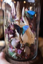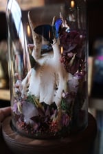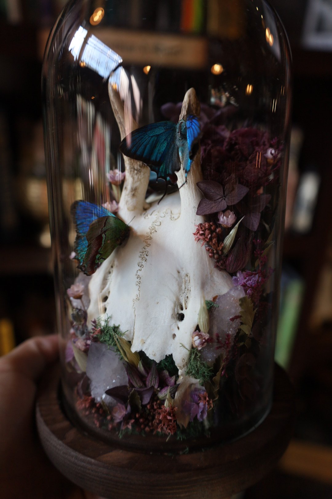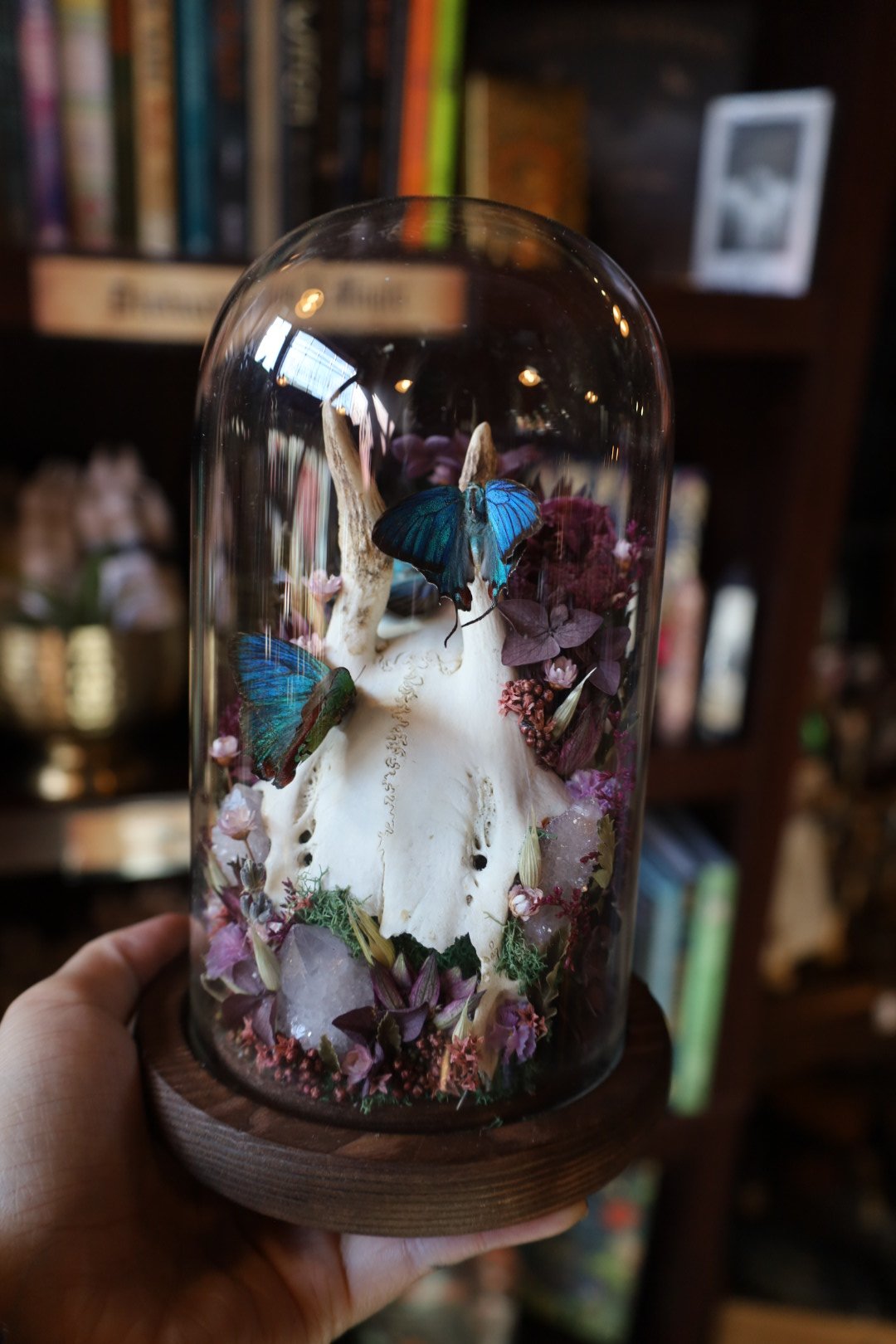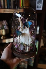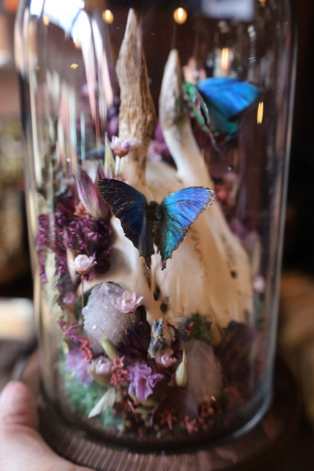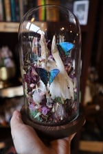 Three regal hairstreak butterflies, roe deer skull cap, spirit quartz clusters, and dried florals.