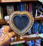 One real preserved orb weaver web inside an ornate heart shaped frame.