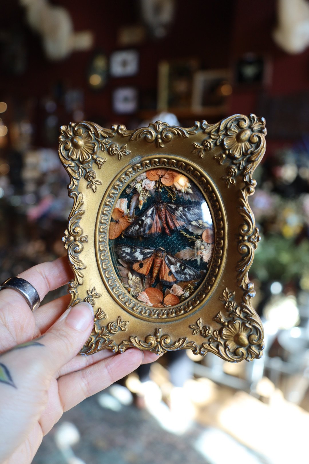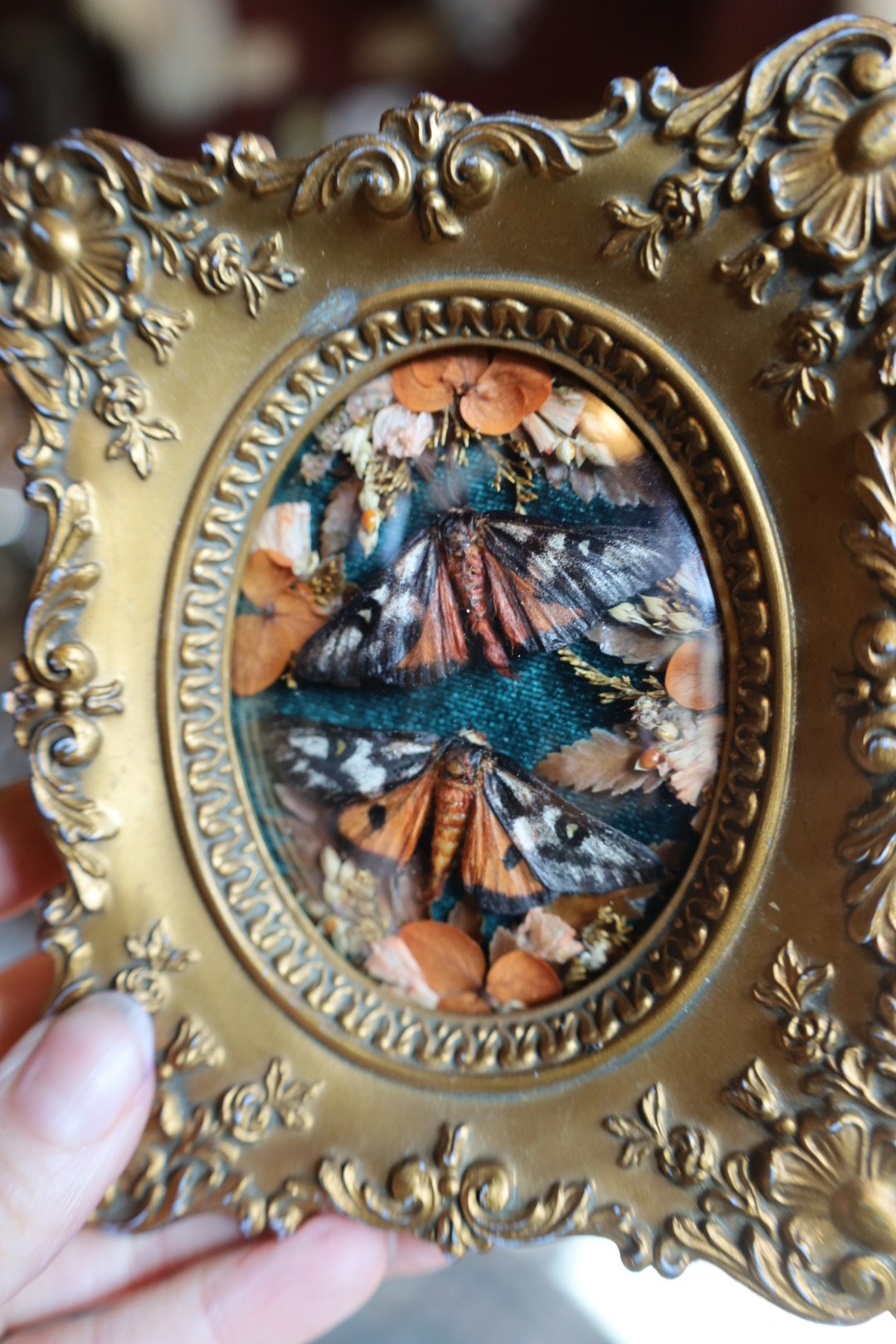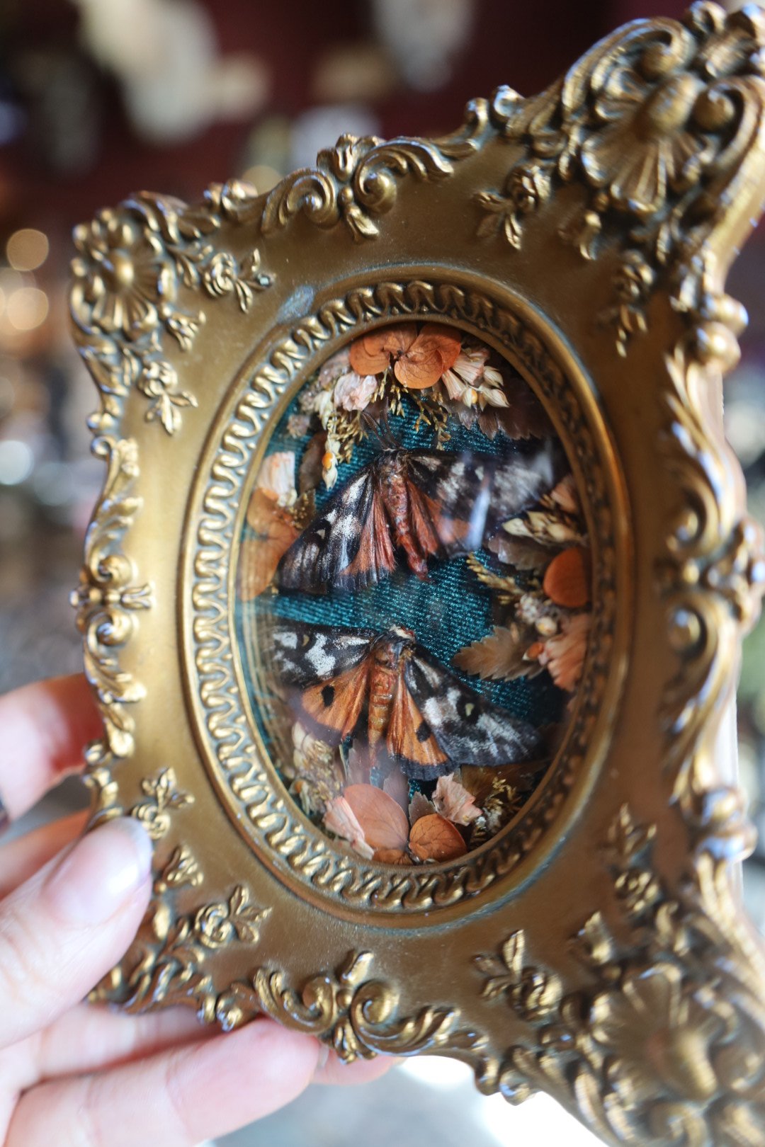 Two moths I don’t remember the name of and dried florals in a vintage frame.